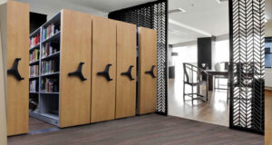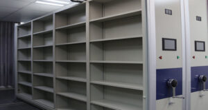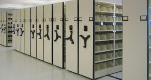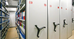 Large volume storage, optimum space utilization. The system provides high density storage requiring only one moving aisle which eliminates the space that would otherwise be taken up by permanent passageways between conventional static shelving. This arrangement can increase up to efficient way in storage and retrieval of information, wether in the form of computer disks, cassettes, video tapes, books and files etc.